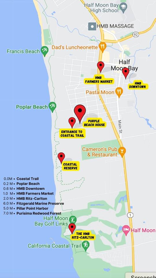 We are about 300 yards from the beach and about a mile to the center of Half Moon Bay -- Main St.